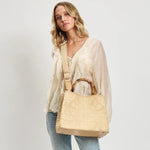 Introducing the Riviera Tote, a perfect blend of style and function for the modern woman. This chic handbag features an elegantly structured silhouette with intricate textural details, making it a versatile accessory for both work and play.