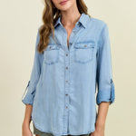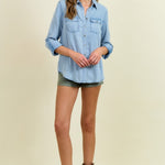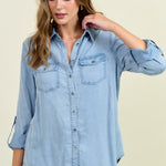 Embrace laid-back style with the Roll Em Up Chambray Button Down, featuring handy roll-up sleeves secured by button tabs for easy warmth control. Its classic point collar and front button closure add timeless charm, while the relaxed, slightly oversized fit makes layering effortless and oh-so-comfy. Perfect for those days when you want to keep it cool and casual with a playful twist.
