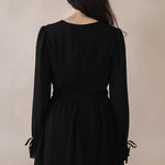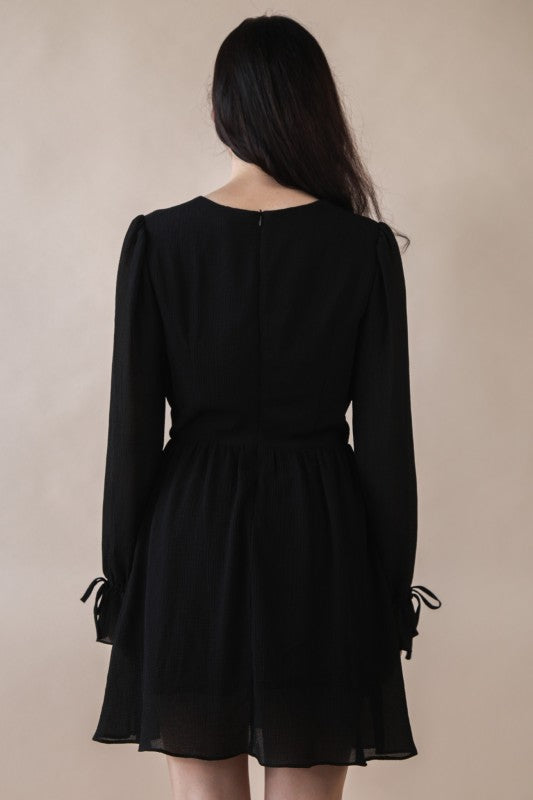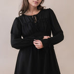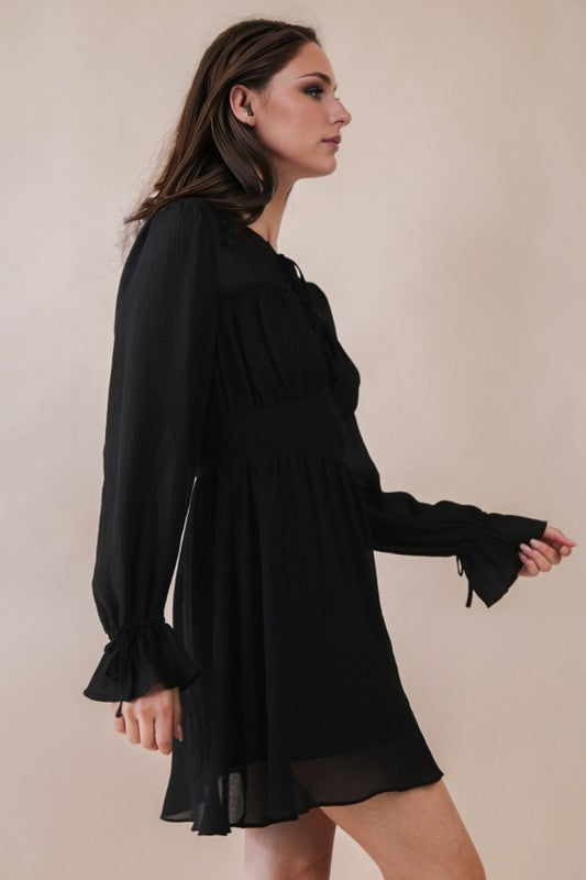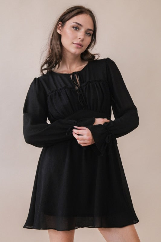 Twirl into any occasion in this charming woven mini dress! Featuring delicate ruffles and bow details that add a touch of whimsy, this piece combines elegance with fun. The round neckline and long sleeves offer a sweet, modest silhouette, while the back zipper ensures an easy fit. Lined for comfort and confidence, this dress is perfect for anyone who loves a little extra flair in their wardrobe.