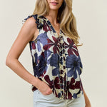 Elevate your style with this Satin & Floral Sleeveless Blouse, featuring a silky smooth satin fabric that flows like a dream. The playful V-neckline is framed with charming ruffle trim, while ruffled cap sleeves add a flirty flutter to your look. Gently gathered at the neckline, it creates a flattering shape that feels as fun as it looks. Perfect for brightening any day with a splash of elegance and whimsy!