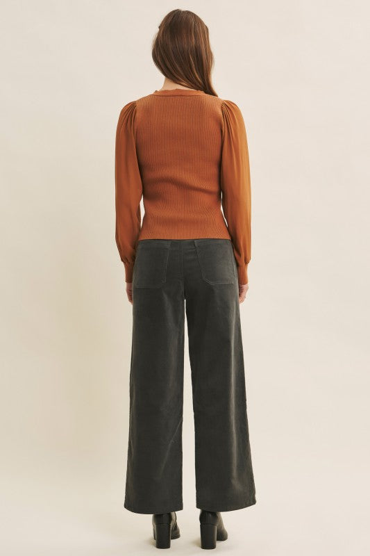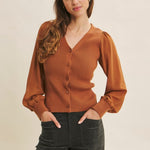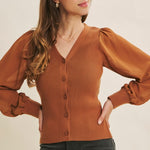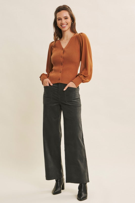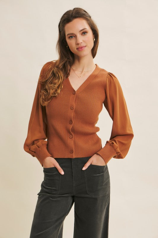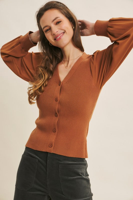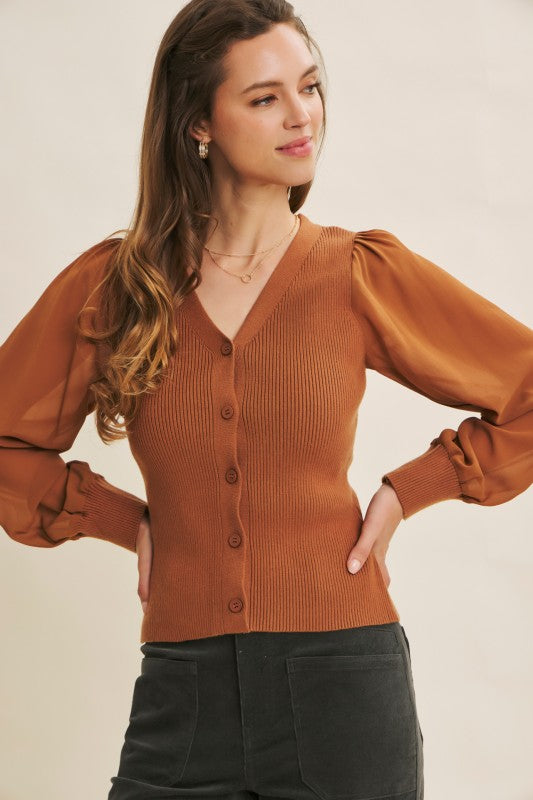 Get ready to turn heads with the Shears To You Sweater Cardigan! This fitted beauty features a ribbed sweater bodice that hugs your curves perfectly, while its sheer, long balloon chiffon sleeves add a whimsical touch. The button-down front and flirty V-neckline make it easy to style for any occasion. Playful and chic, this cardigan is your new go-to for a look that’s equal parts cozy and captivating.