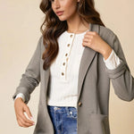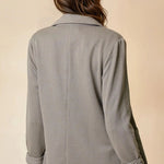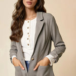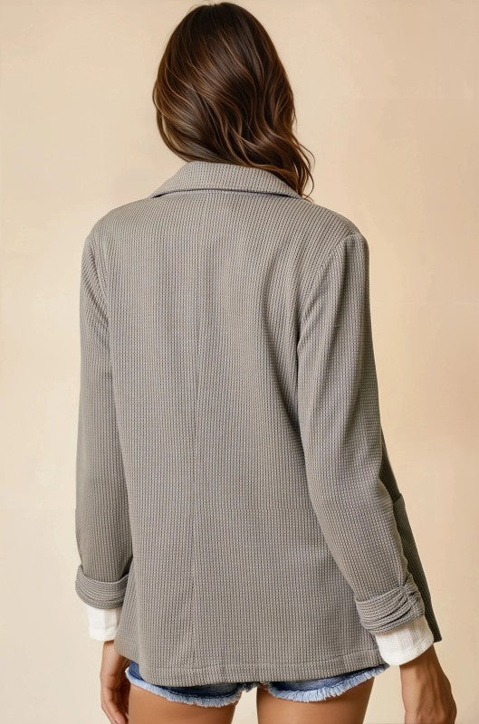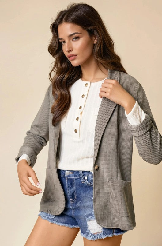 Elevate your style with this playful textured blazer featuring a chic ribbed knit pattern and eye-catching shirred sleeves that add a fun, feminine flair. The single-button front keeps your look sleek and versatile, while functional front pockets blend convenience with fashion. Finished with a classic notched lapel collar, this blazer is perfect for turning heads wherever you go.