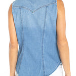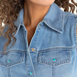 Effortlessly chic and breathable, this sleeveless slim shirt is crafted in stretch linen for comfort and ease. Featuring vibrant turquoise snap buttons, it adds a pop of color and personality to a timeless silhouette — perfect for warm-weather layering or standalone wear.