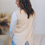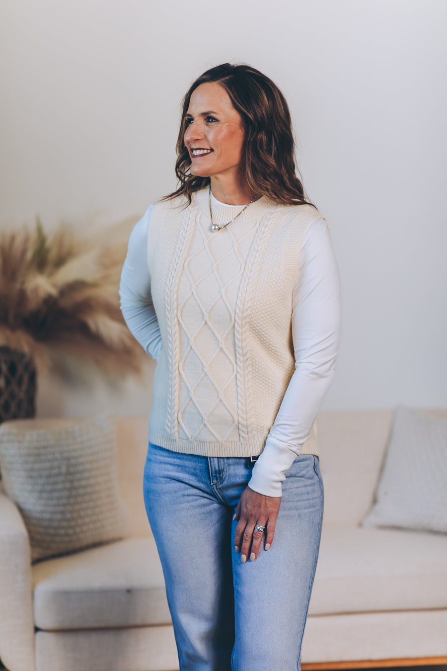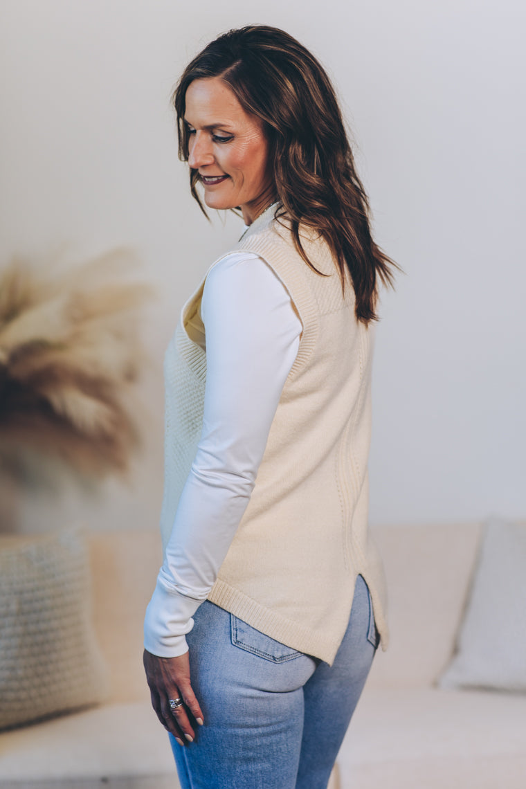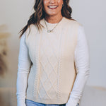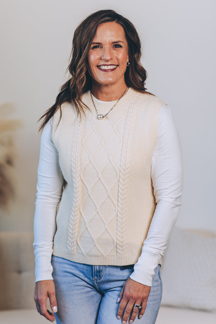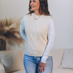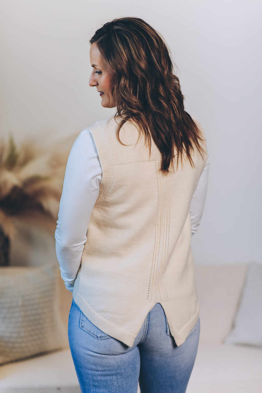 Add a touch of sophistication to your spring wardrobe with our Slit Back Cable Knit Sweater Vest. This versatile layering piece features a cute slit back detail, perfect for elevating any outfit. Embrace luxury and elevate your style with this must-have piece.