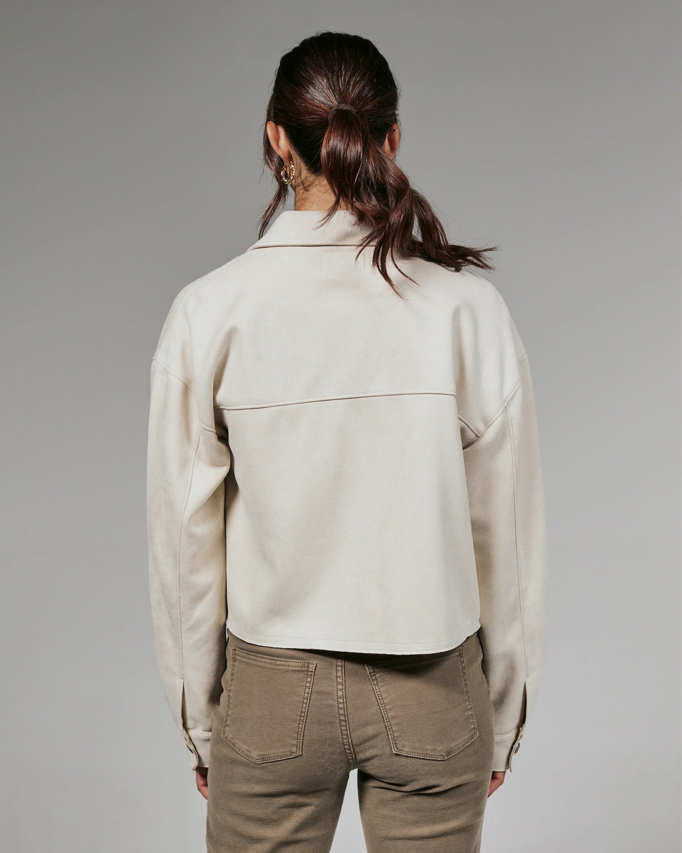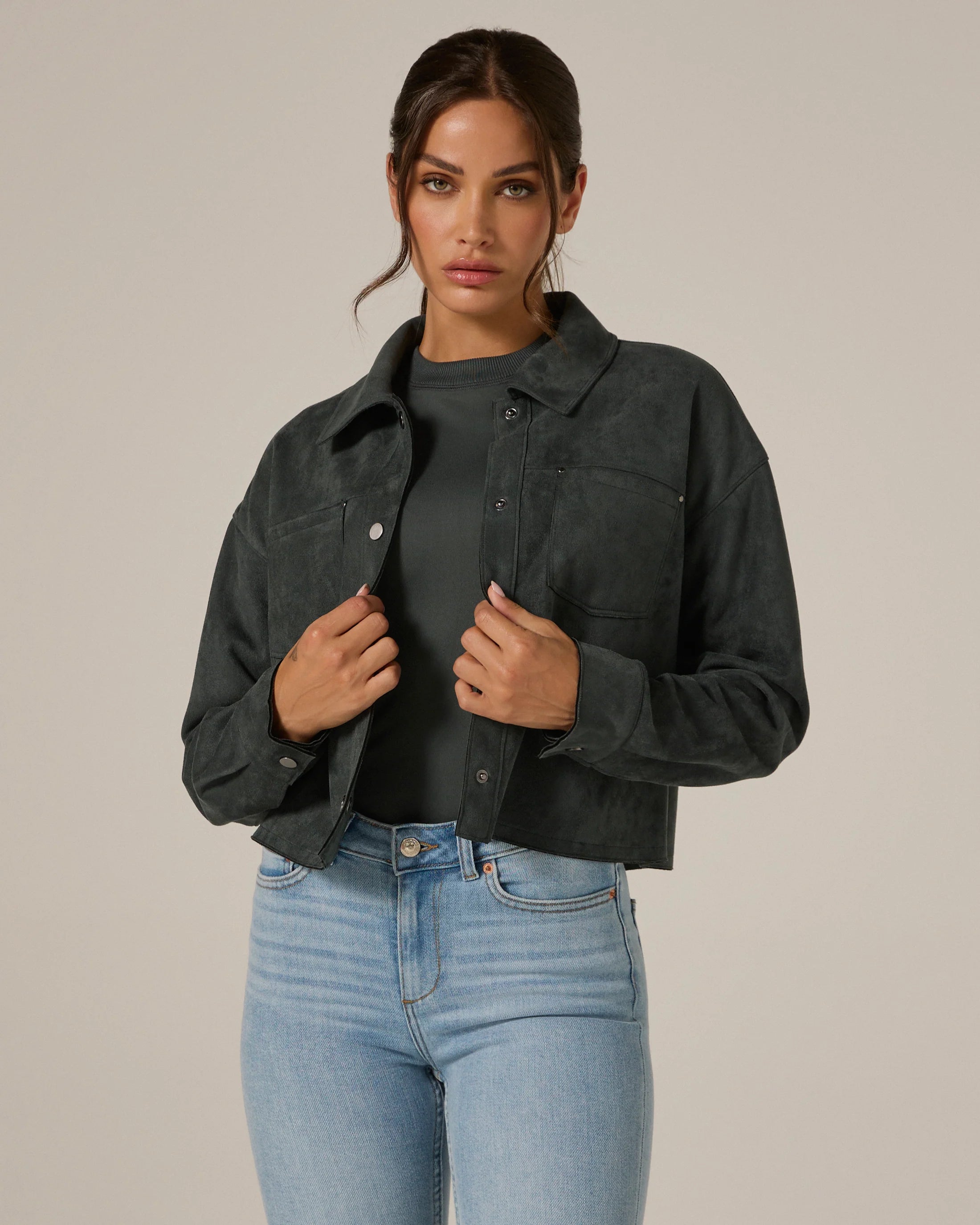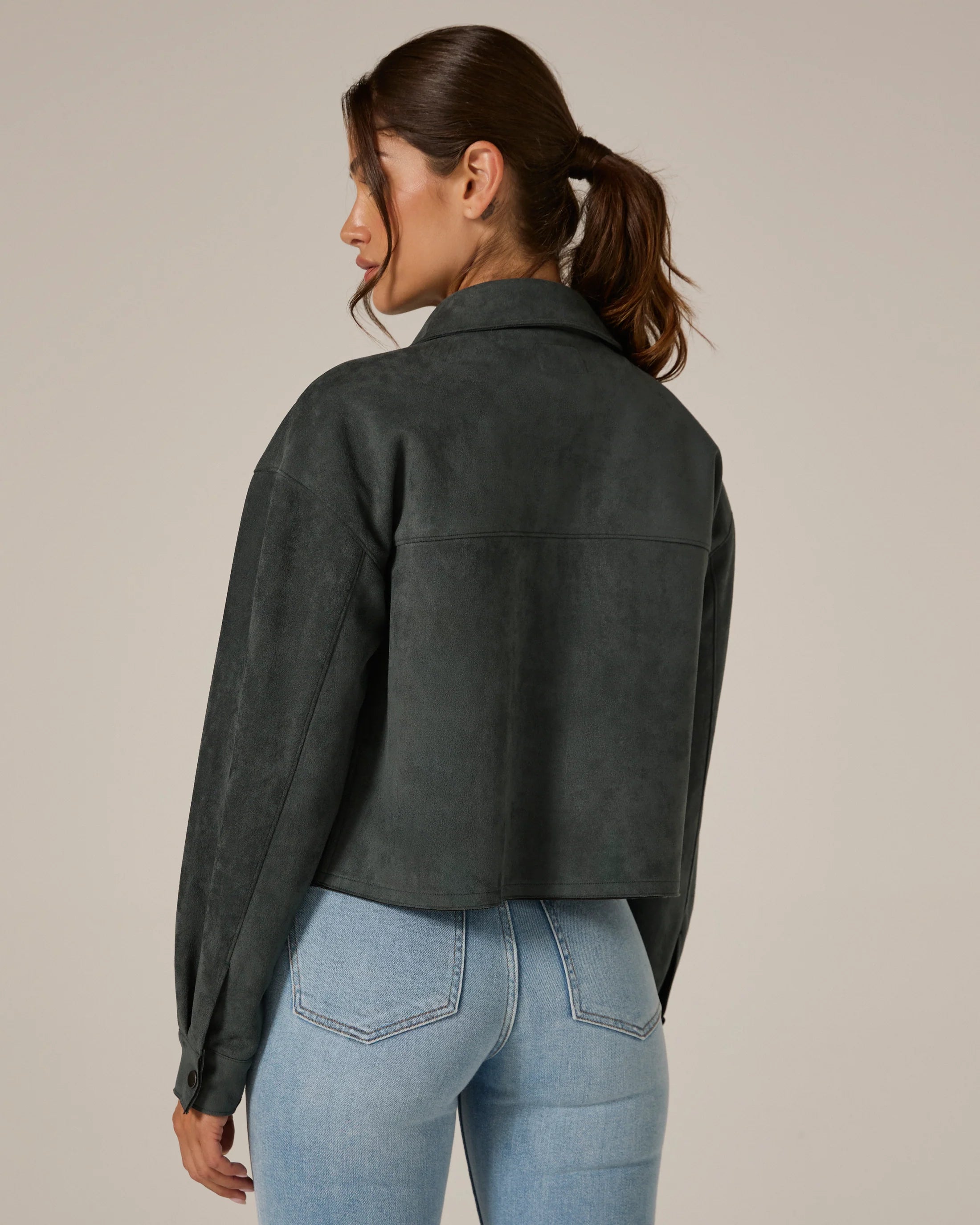 A modern suede crop jacket made intentionally roomy for a comfortable fit. Wear this over your top or dress on a spontaneous night out.