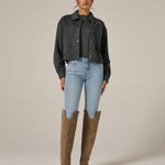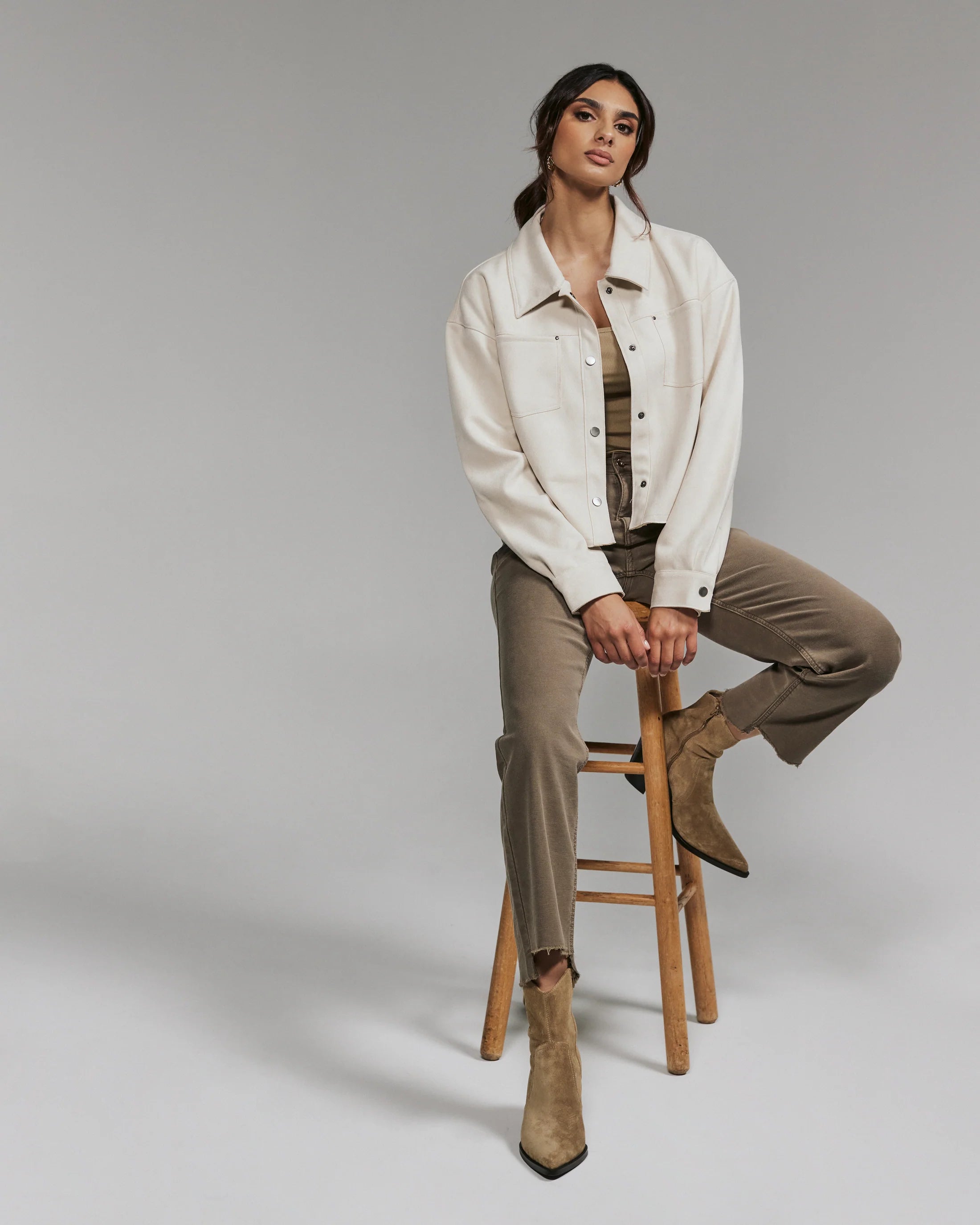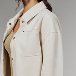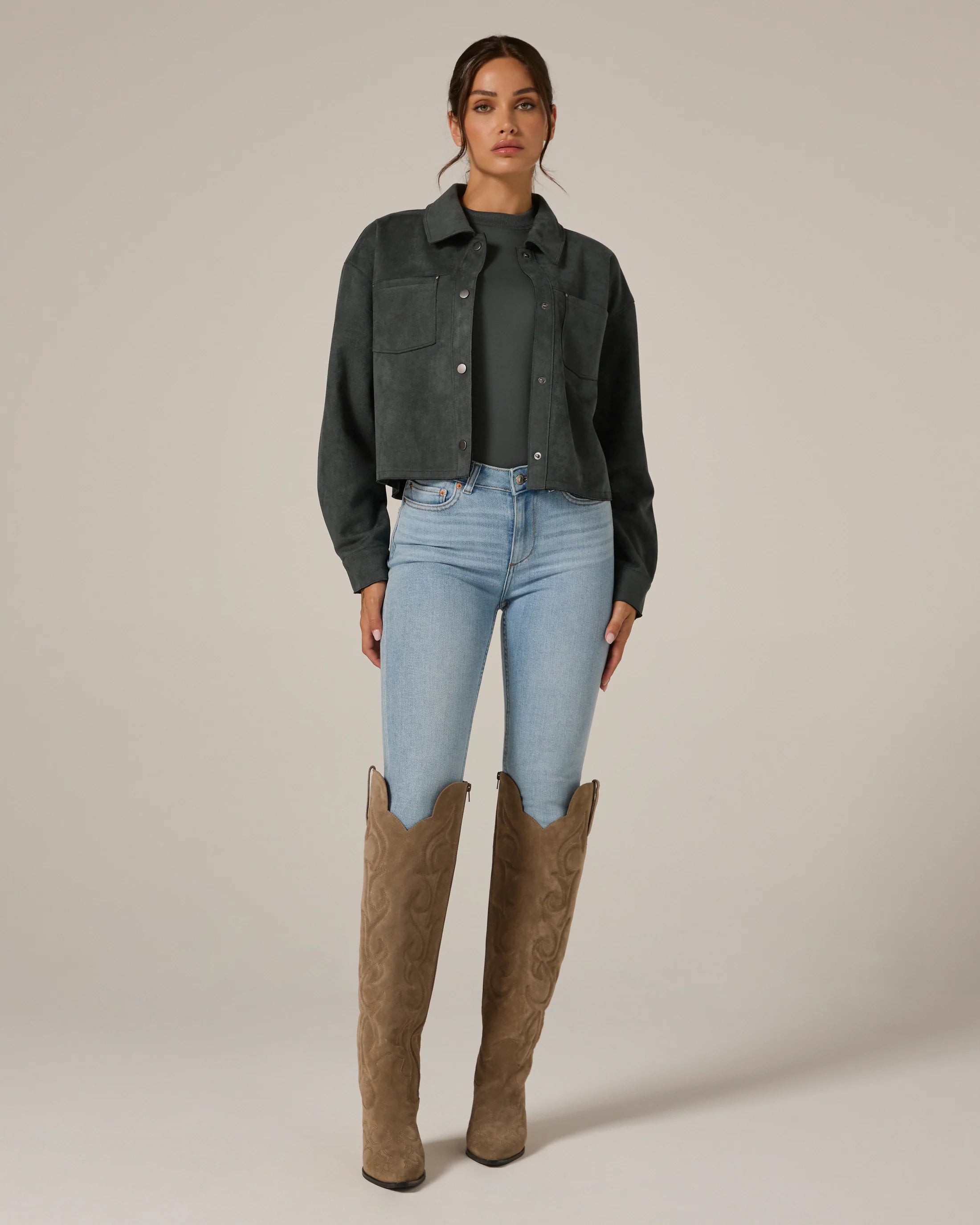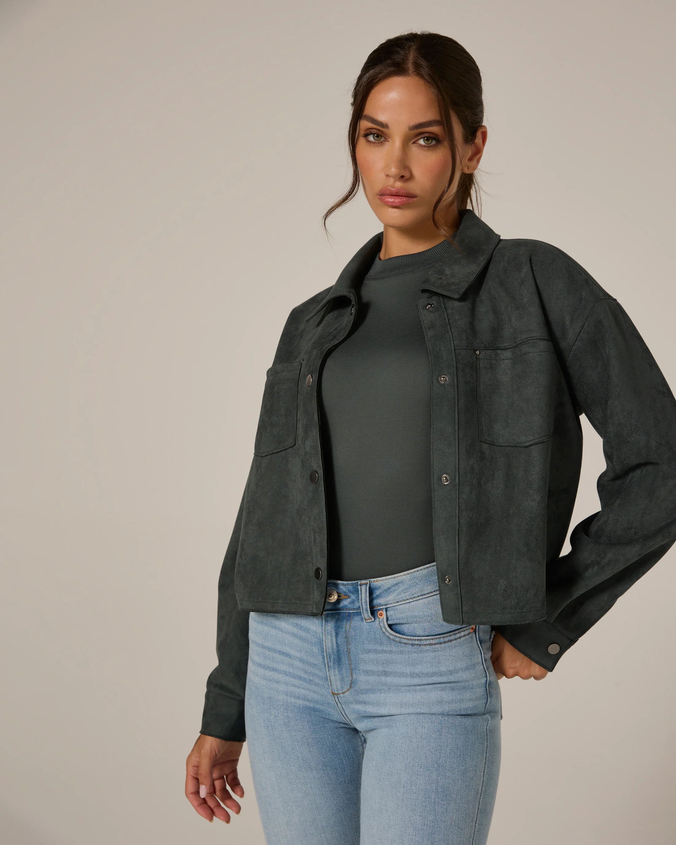 A modern suede crop jacket made intentionally roomy for a comfortable fit. Wear this over your top or dress on a spontaneous night out.