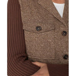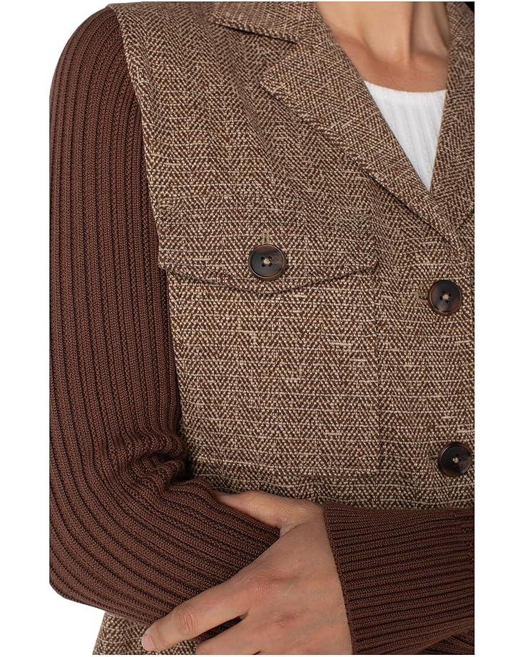 - The Liverpool™ Los Angeles Herringbone Shacket W/ Sweater Sleeves is a modern take on a traditional style, combining the classic appeal of denim with the comfortable coziness of knitwear. It features a buttoned front closure, notched collar, and two flap chest pockets in a classic silhouette, with contrasting sweater sleeves that add a unique touch. Crafted from soft, textured knit fabric, these sleeves offer both warmth and style, making this shirt jacket stand out.