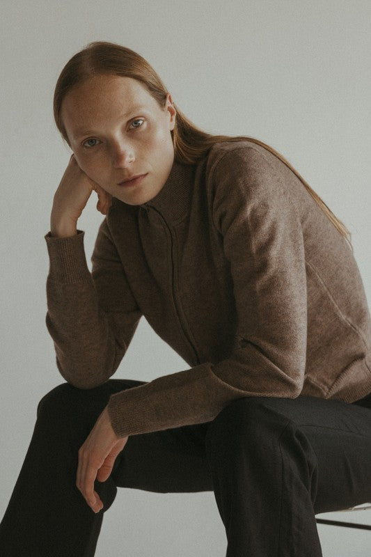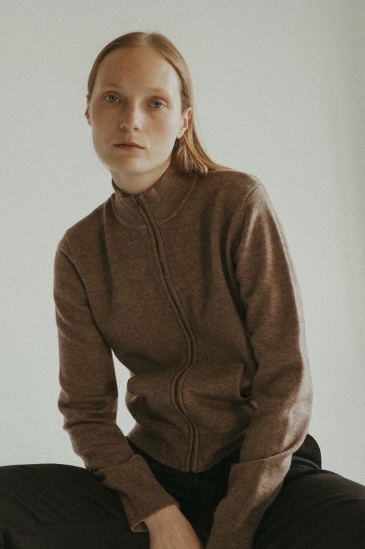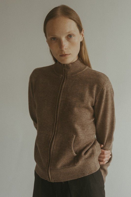 The Allison Sweater is a knit zip-up sweater, perfect for transitioning between seasons. It is crafted from a mid-weight knit blend and features a high-neck collar for a modern design. For added functionality, it also features two front pouch pockets. Versatile in styling, wear this sweater over a fitted tee or zipped up as a top.