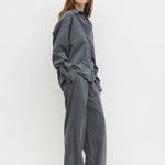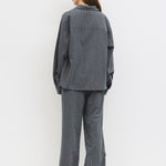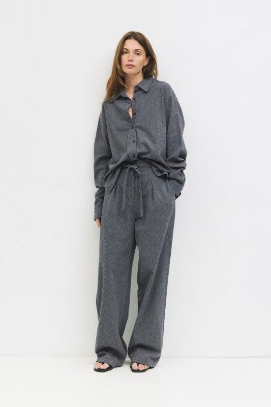 The Ellen Pants are oversized striped trousers crafted from brushed midweight fabric, featuring front pleats for a tailored touch. Designed with a back elastic waistband, front button, and hidden zipper closure, and two side hidden pockets.