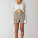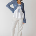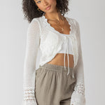 Elevate your wardrobe with this flirty tie-front cardigan featuring stunning crochet detailing that adds texture and charm. Available in two gorgeous colorways, this piece brings playful sophistication to any outfit. The adjustable self-tie front lets you customize the fit while showcasing the intricate crochet work. Perfect for layering over dresses or pairing with your favorite basics for an effortlessly chic look.
