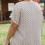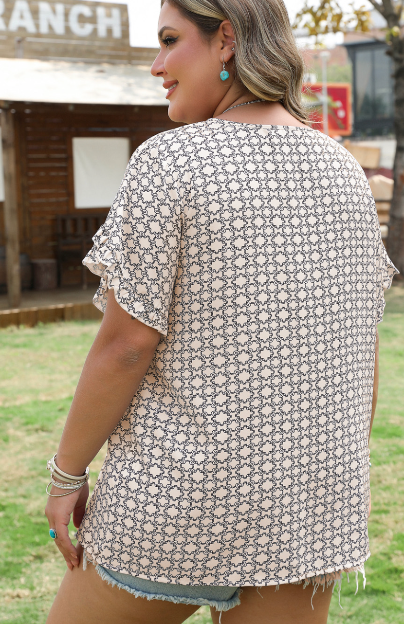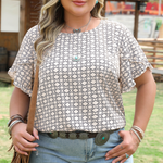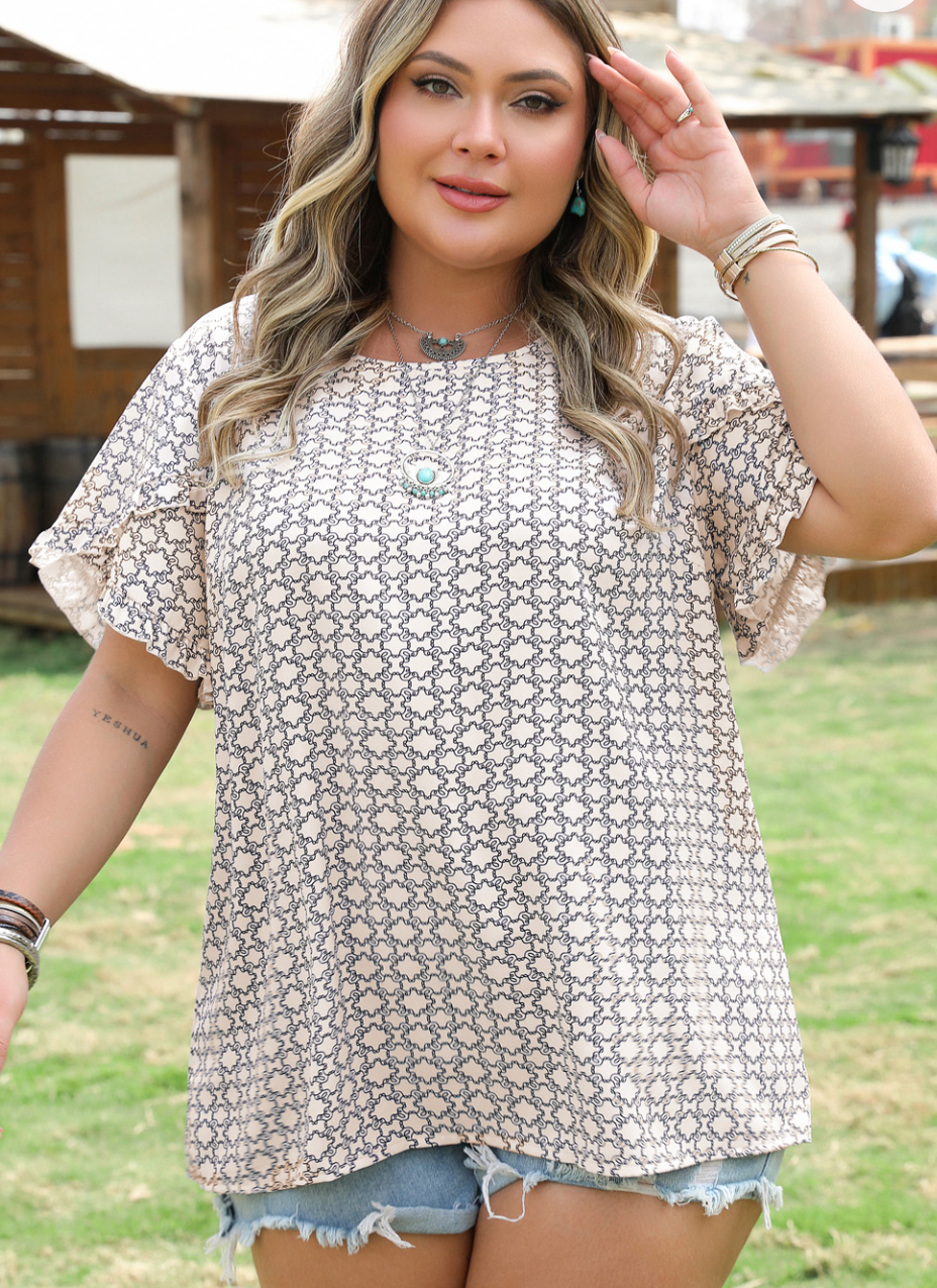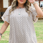 Add a playful flair to your wardrobe with the Tulip Sleeve Geo Blouse in plus size. Featuring bold geometric patterns and charming ruffled sleeves, this blouse offers both style and comfort. The classic crew neck design makes it easy to pair with your favorite jeans or skirts, perfect for everyday wear with a fun, feminine touch.
