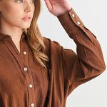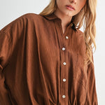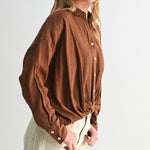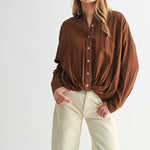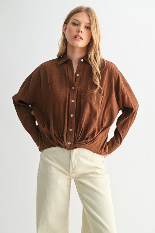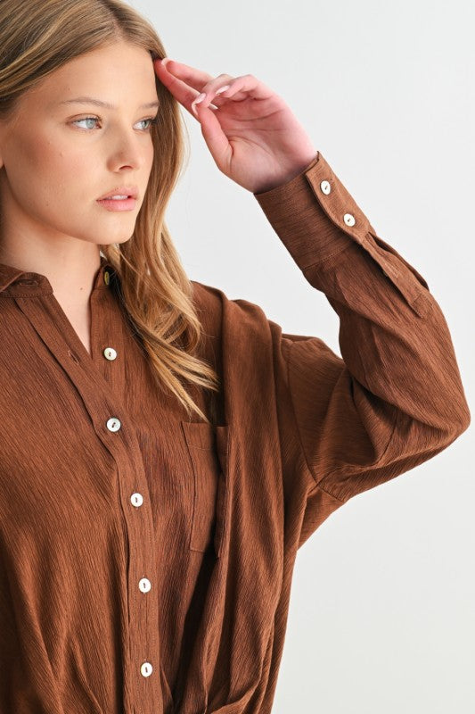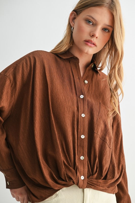 Meet your new favorite blouse—our Twist Hem Button Down! Crafted with a unique woven texture, this playful shirt adds a fun twist (literally) to your everyday style. The hem’s subtle twist and classic button-down design make it perfect for mixing casual charm with a hint of sophistication. Whether you’re heading to brunch or dressing up for a night out, this blouse promises comfort and personality in every wear.