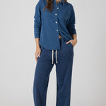 Slip into ultimate comfort with this washed knit button-down shirt—the perfect lounge essential that pairs flawlessly with our matching pants. Featuring a full button closure for easy layering and adjustable coverage, this relaxed-fit piece is your new go-to for cozy days at home or casual outings. The soft, lived-in knit fabric feels like a warm hug, while the timeless design keeps you looking effortlessly put-together. Mix and match with our coordinating bottoms to create your ideal loungewear set.