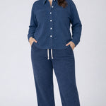 Slip into ultimate comfort with this washed knit button-down shirt—the perfect lounge essential that pairs flawlessly with our matching pants. Featuring a full button closure for easy layering and adjustable coverage, this relaxed-fit piece is your new go-to for cozy days at home or casual outings. The soft, lived-in knit fabric feels like a warm hug, while the timeless design keeps you looking effortlessly put-together. Mix and match with our coordinating bottoms to create your ideal loungewear set.