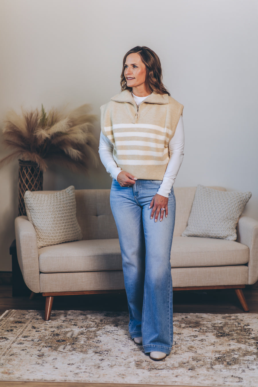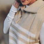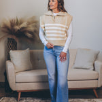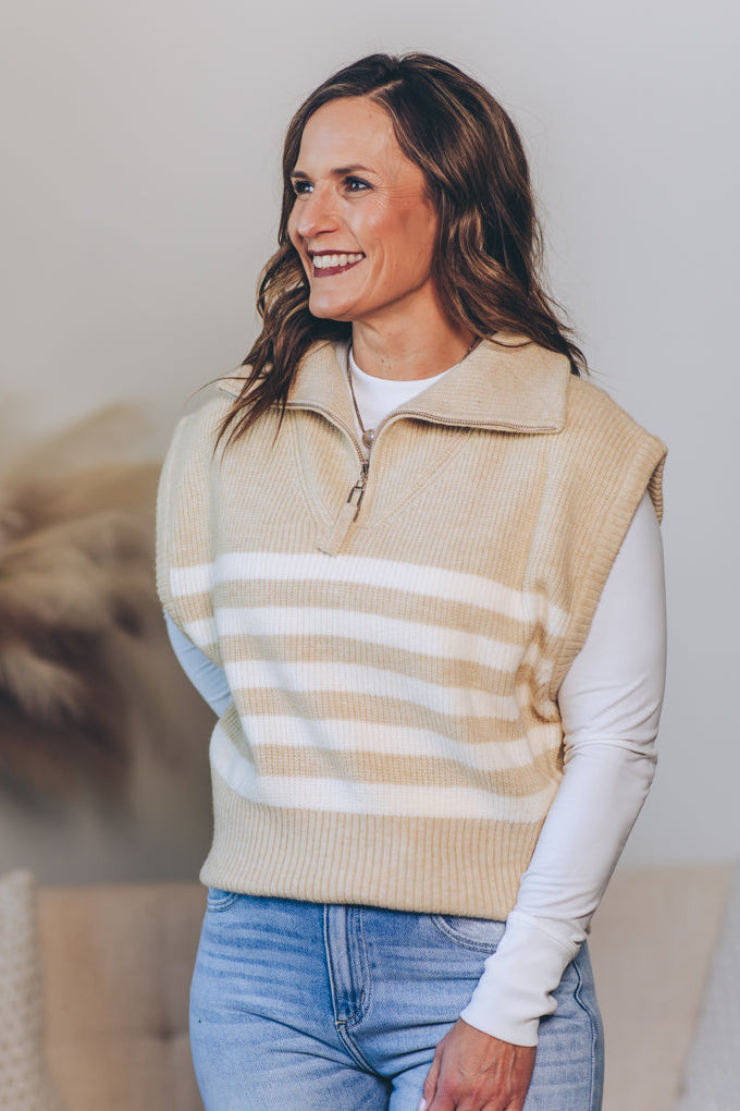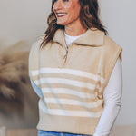 This sleeveless knit top brings fun to your wardrobe with its bold horizontal stripes and wide collar. The half zip-up front lets you play with your look, while the ribbed hem and arm openings keep it comfy and structured. Perfect for layering or wearing solo on sunny days!