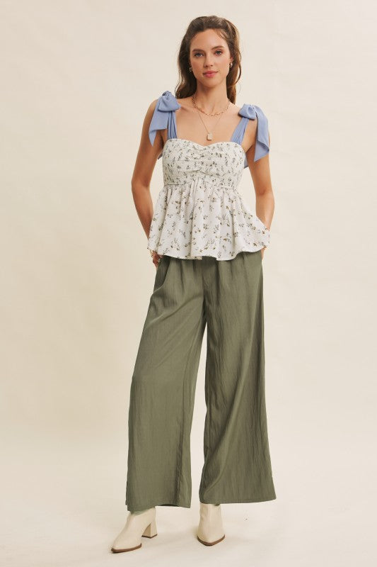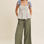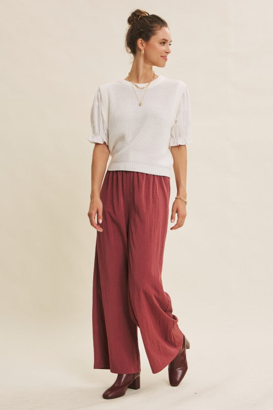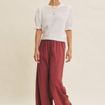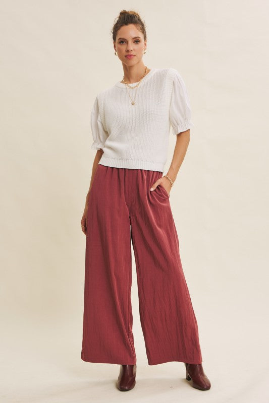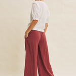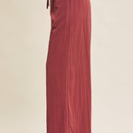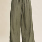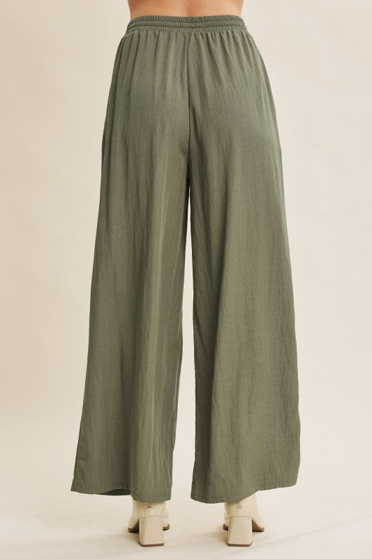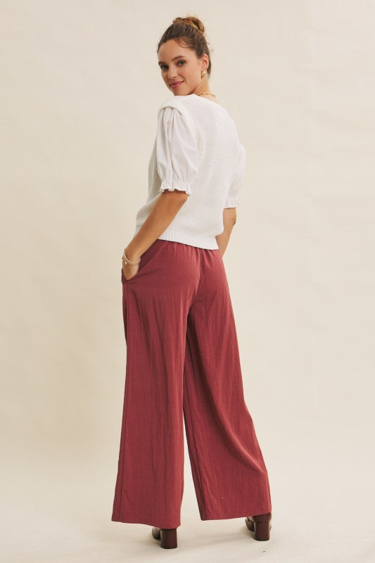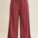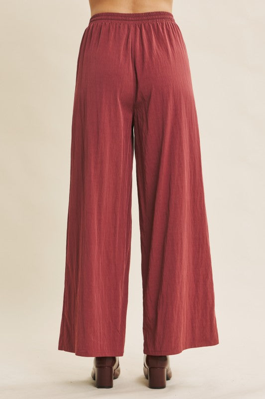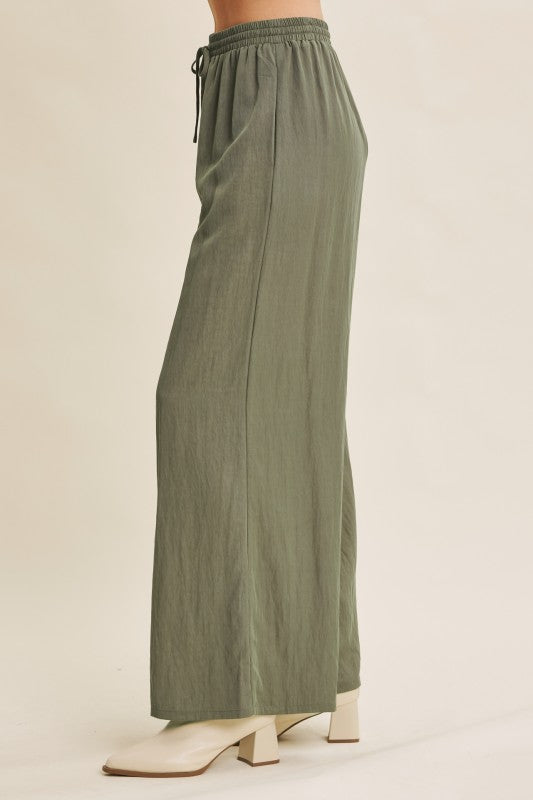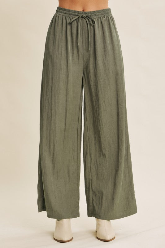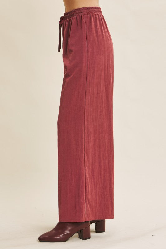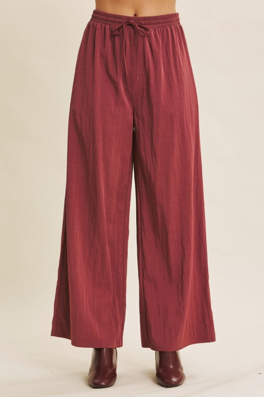 Airy wide-leg pants crafted from a lightweight viscose blend. Features an elastic waistband with drawstring for adjustable comfort, side pockets, and a softly washed finish. Perfect for transitional styling-pairs well with knits or woven tops.
